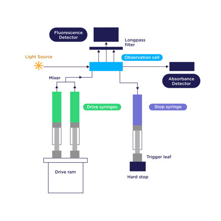 The new reagents are then mixed into the observation cell, pushing out any old reagents into the stop (waste) syringe. The stop syringe piston then pushes the trigger leaf against a hard stop, which "stops" the flow and begins data collection. The observation cell is irradiated with a particular wavelength of light, and PMT detectors are mounted at 180° (for absorbance) and 90° (for fluorescence), allowing monitoring of either signal as a function of time.